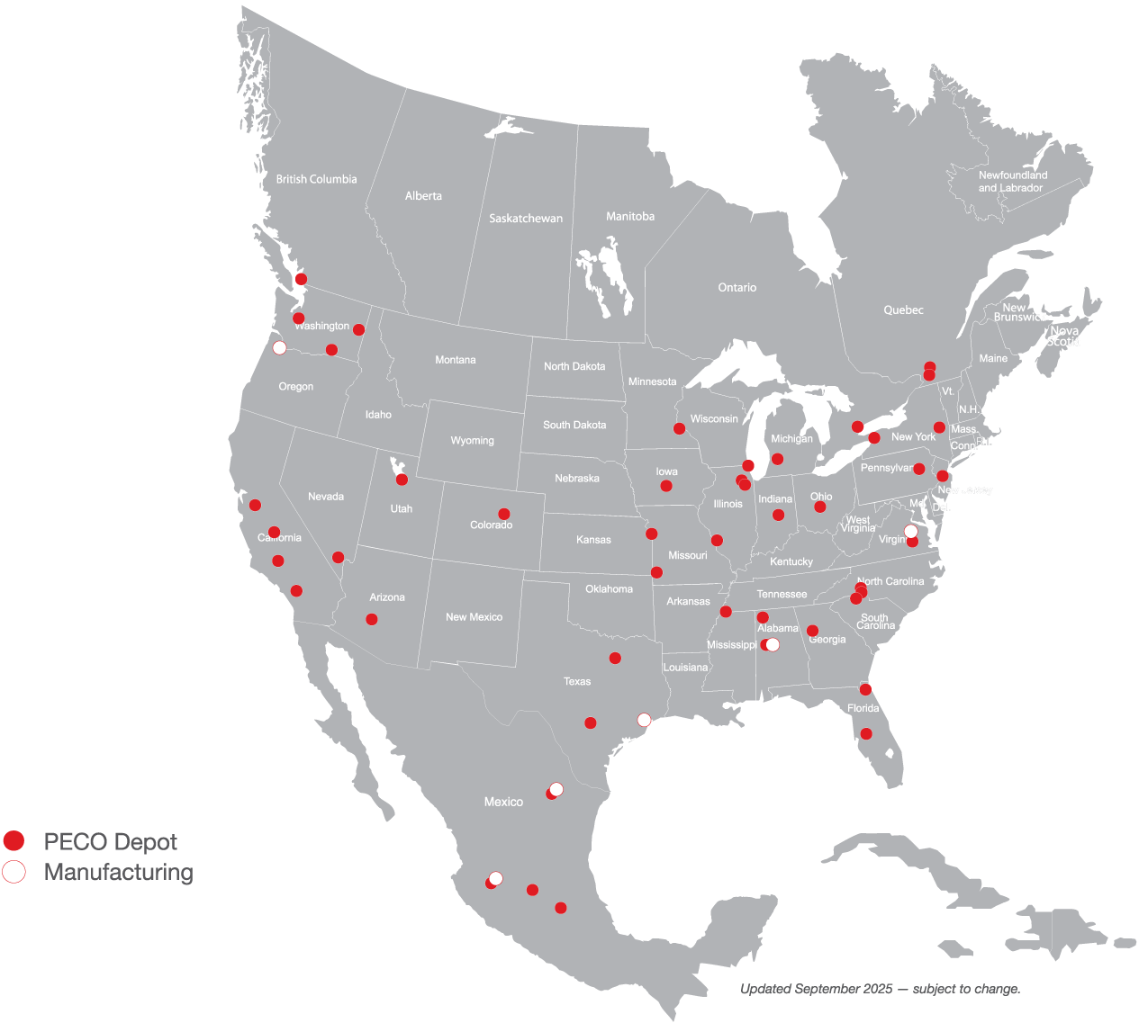 PECO Pallet's extensive North American service network includes 40+ full-service depots, 50+ sort and storage facilities, and 2,900+ pallet recovery locations that manage approximately 70 million annual pallet issues across the U.S., Canada, and Mexico.